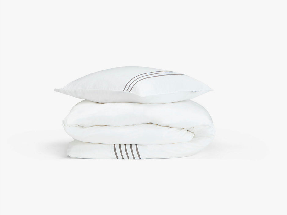 Stiltje Duvet Cover Set, SingleExclusive duvet cover and pillow case in white cotton satin with decorative grey lines, 150x210 cm. Made in Egyptian cotton with a thread count of over 300 threads per inch. Oeko-Tex® Standard 100 certified. -