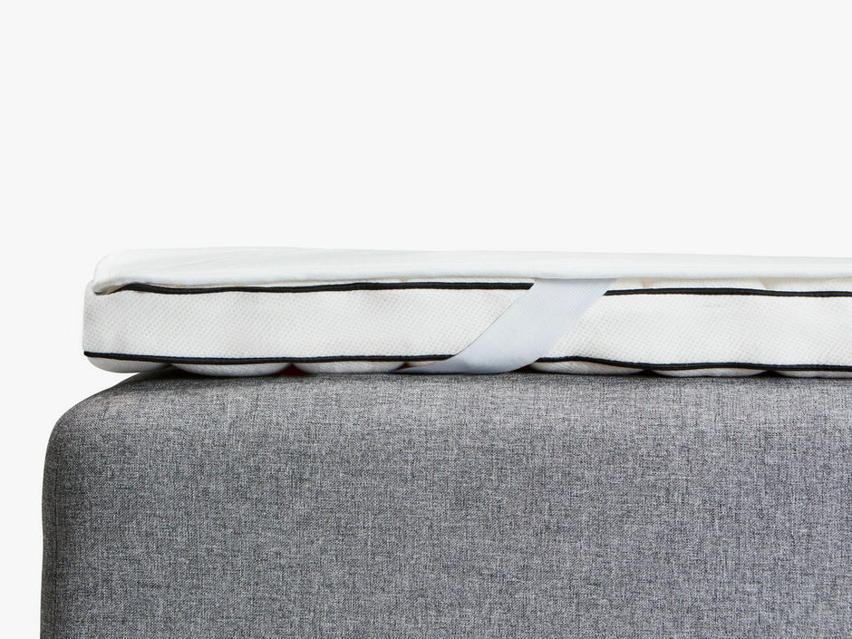 Prestige Mattress TopperA plush, yielding mattress topper filled with Talalay latex and fibre. Removable and washable white stretchy cover with a decorative contrasting black band. Available in several sizes. -