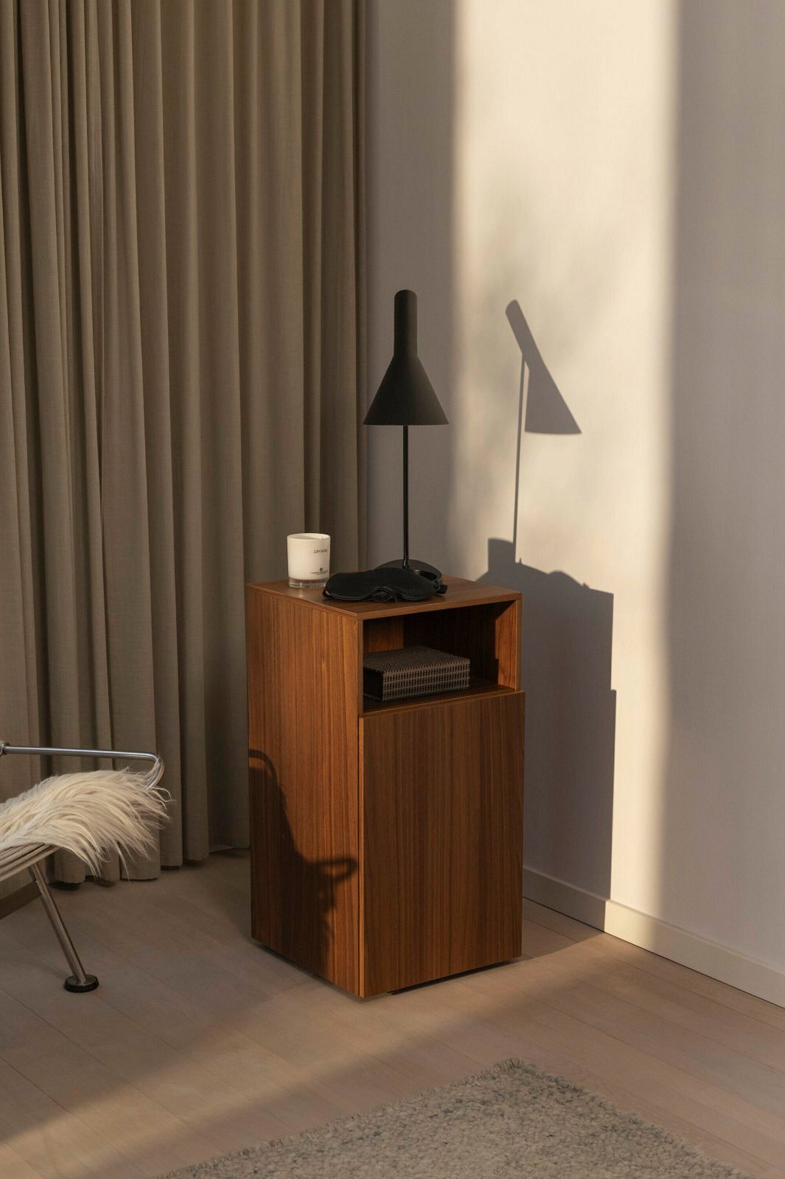 A collection of nightstands featuring clean lines and a minimalistic design, available in various sizes, materials and finishes.