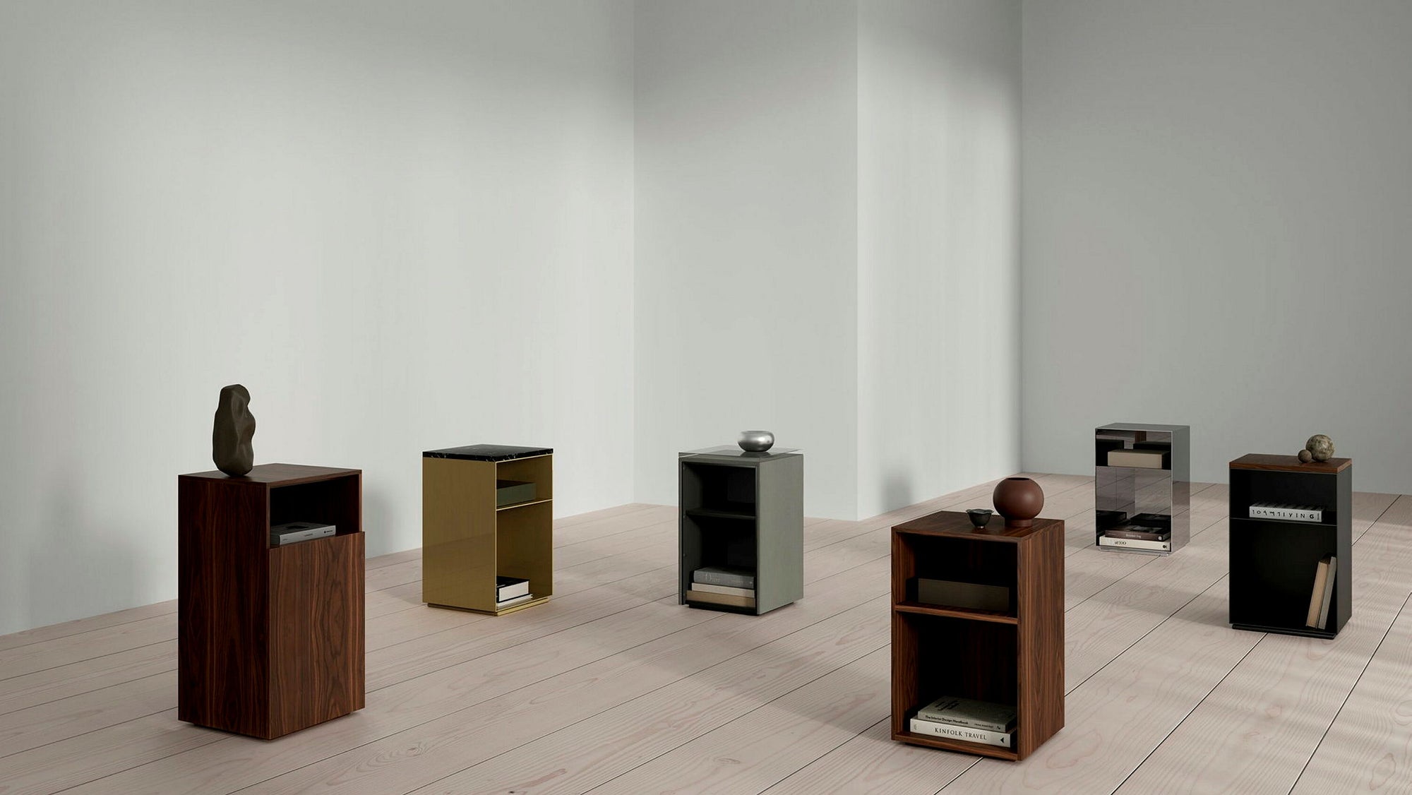 A collection of nightstands featuring clean lines and a minimalistic design, available in various sizes, materials and finishes.