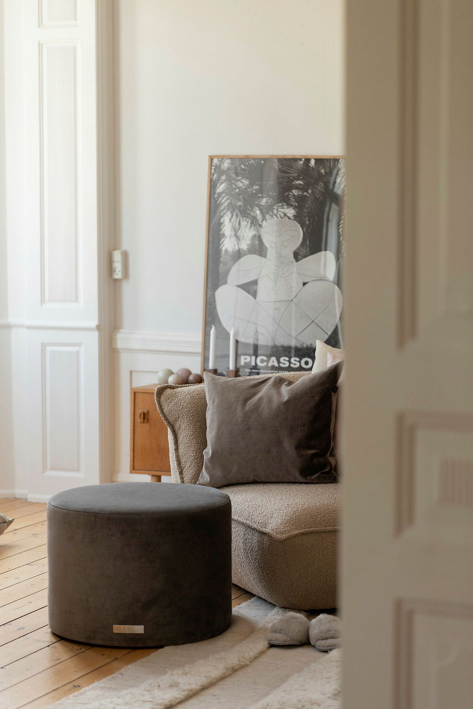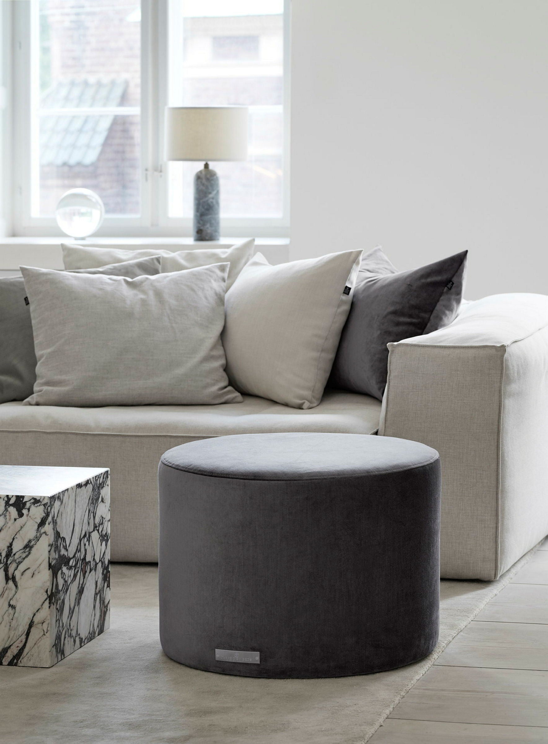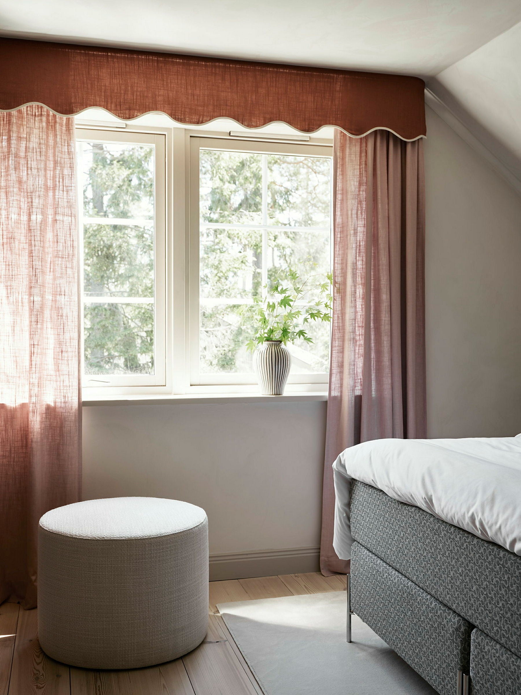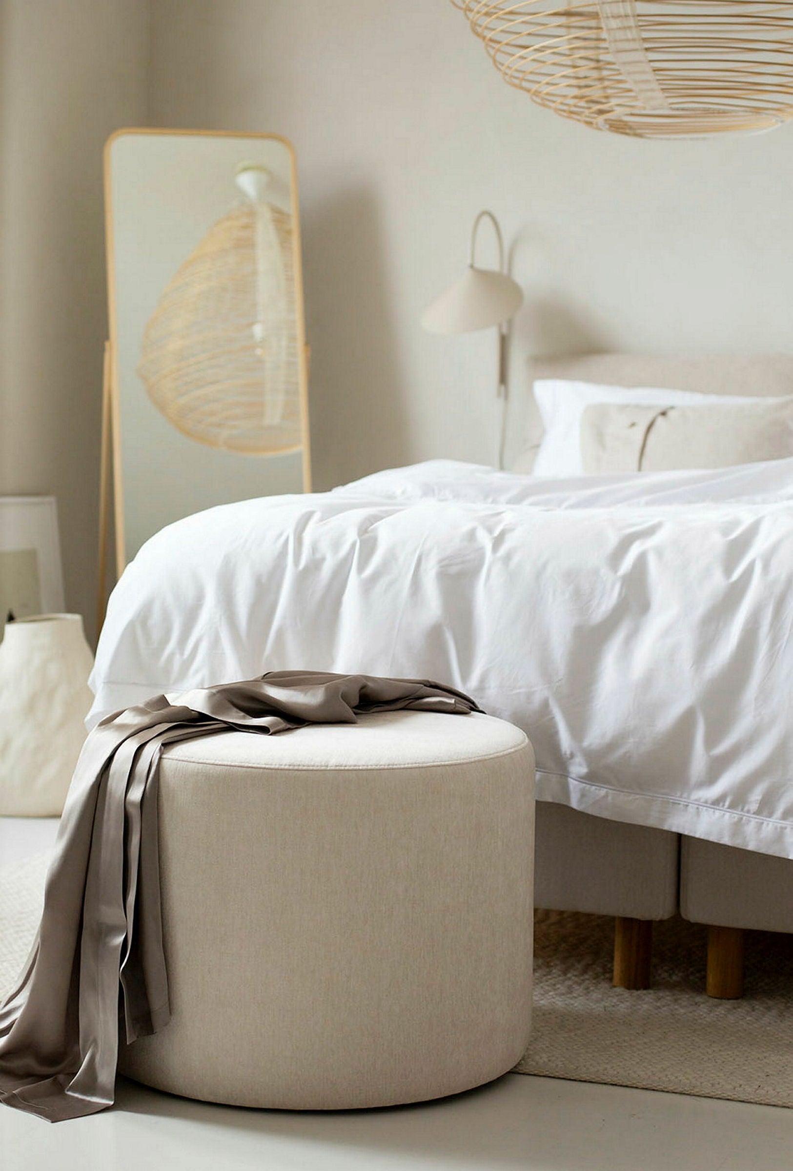 A high-quality, round, small pouf that is the perfect bedroom addition. Choose from 44 different fabrics and colours. Handmade in Sweden.