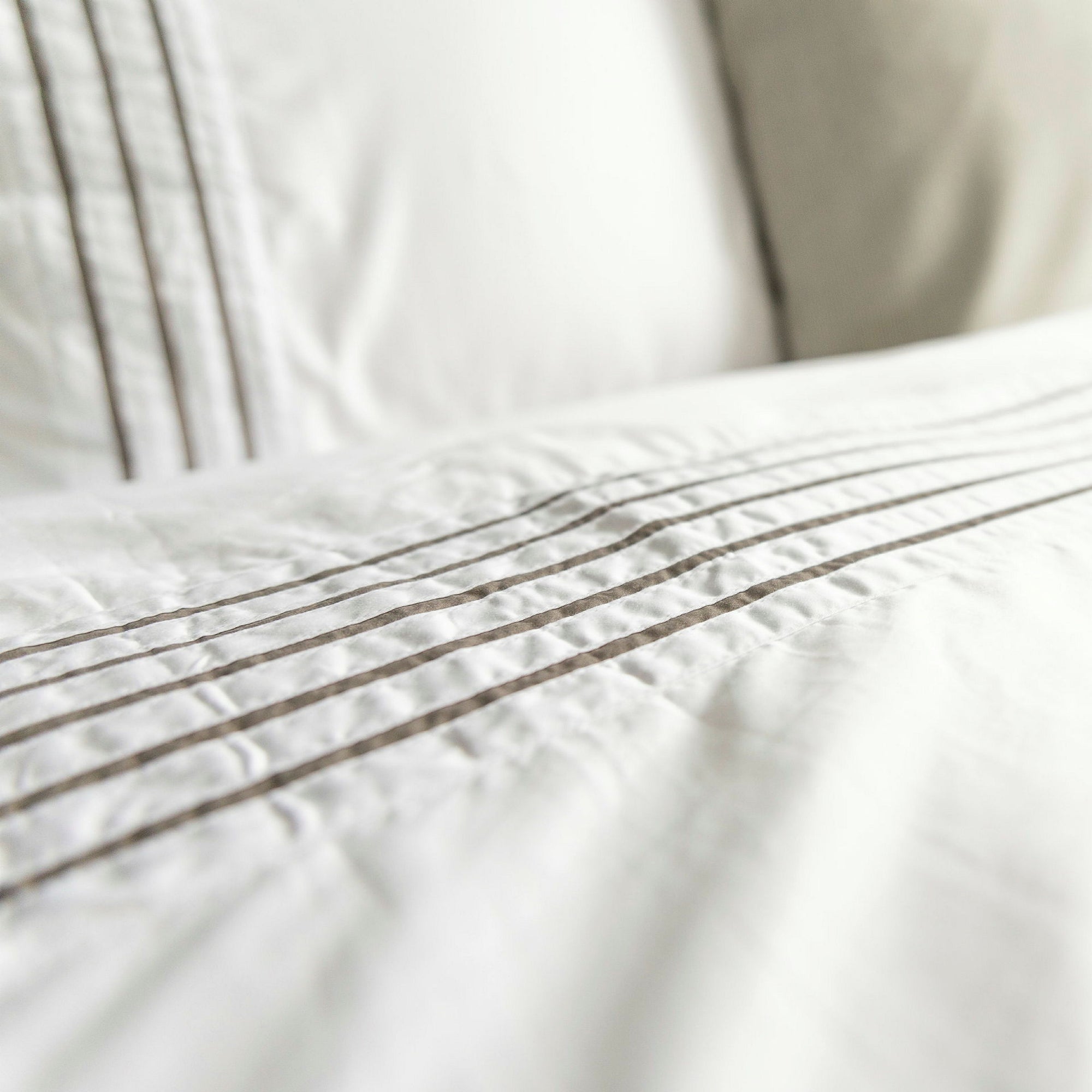 Exclusive duvet cover set in white cotton satin with decorative grey lines for a double bed with two pillow cases, 240x220 cm. Made in Egyptian cotton with a thread count of over 300 threads per inch. Oeko-Tex® Standard 100 certified.